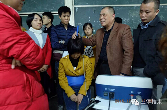 目前,“三得技术”系列设备已进入市场,产品系列覆盖大型医院、社区医院、民营医疗体以及家庭(个人)保健应用几大领域。在教学现场,吴国宪总工程师让2位女学员体验了三得设备中的“SD-J-E-家用型”电磁治疗仪,他使用多功能电磁探头为女学员进行头部穴位的刺激调理,这是“三得技术”中的一项“穿透毛发障碍”技术创新,从而为日常的头部理疗即预防和减低脑中风危险,提供了有效的解决方案。